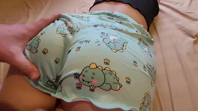 This 18-year-old cute girl with a massive ass wears her pajama shorts as she lets me rub my dick all over her. I slap her ass and make her cum, then rub my cum on her pajama-covered butt.